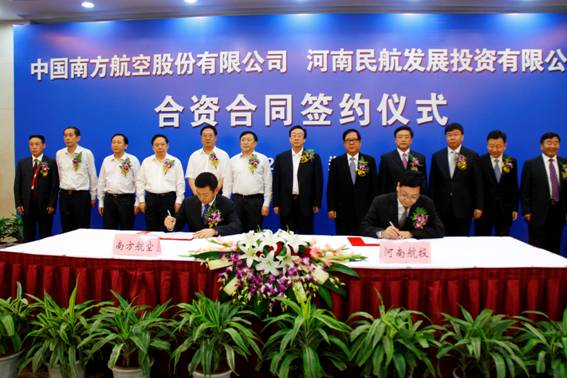 On September 24, 2012, HNCA and China Southern Air holding Company (CSAH) signed a joint venture contract to jointly establish China Southern Airlines Henan Airlines Co.,Ltd. Guo Gengmao, the deputy secretary and governor of Henan Province, Zhang Dawei, the vice governor of Henan Province, Si Xianmin, the executive manager of CSAH and President of China Southern Airlines Co., Ltd., and Tan Wangeng, the Executive Manager of China Southern Airlines attended the signing ceremony. Zhang Dawei and Tan Wan’geng gave speeches respectively on the ceremony. Zhang Mingchao, the Chairman of HNCA, and Xu Jiebo, the executive director and deputy general manager of CSAH, representing the two sides of the cooperation, signed the joint venture contract.