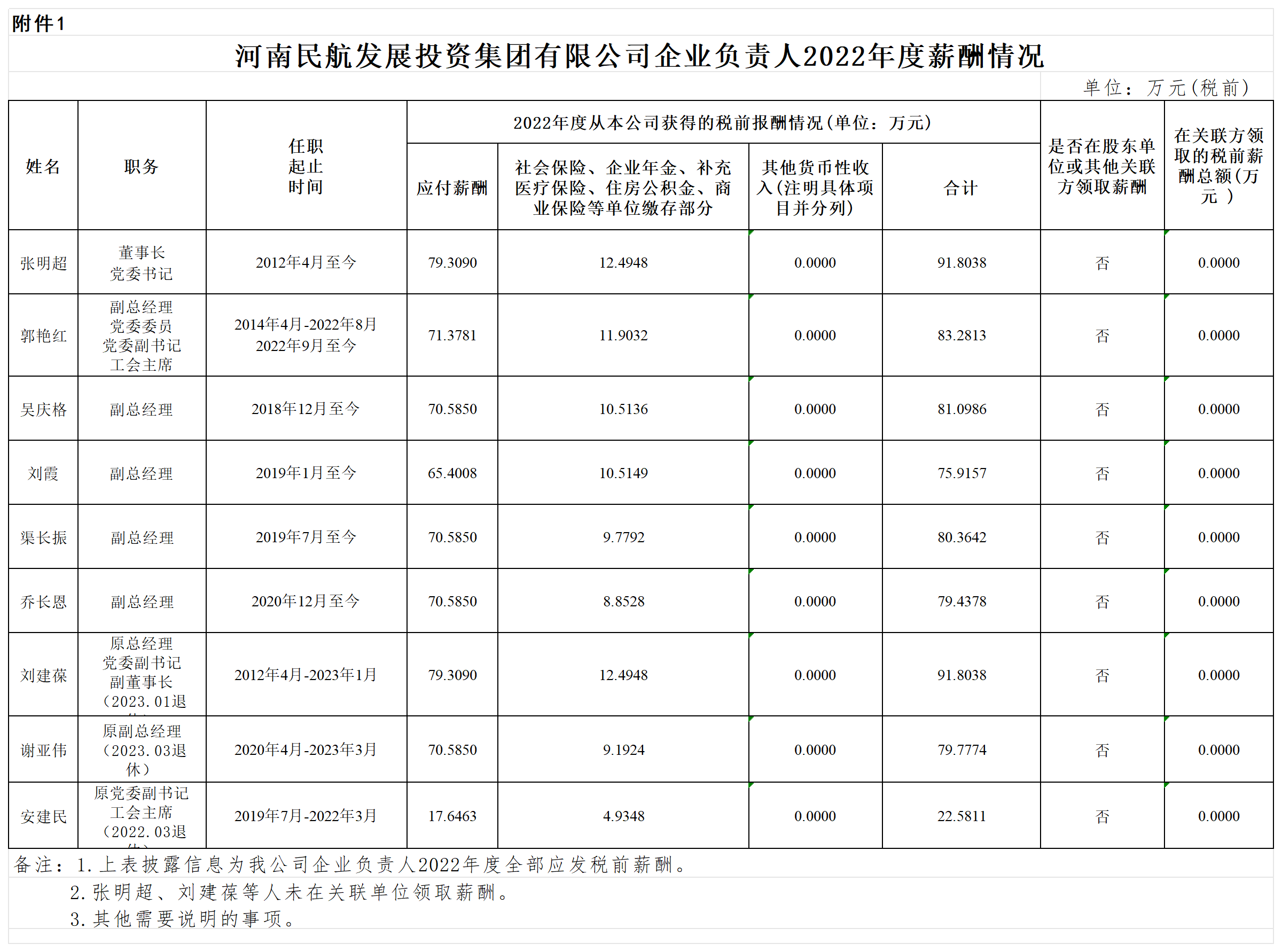 河南民航發(fā)展投資集團(tuán)有限公司企業(yè)負(fù)責(zé)人2022年度薪酬及2020-2022年任期激勵收入情況