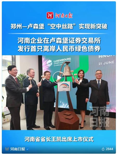 當?shù)貢r間6月21日上午,中豫航空集團以河南航投為主體發(fā)行的3年期人民幣境外債券上市儀式在盧森堡證券交易所舉行。這是中國企業(yè)在歐洲發(fā)行的首只支持可持續(xù)航空燃料(SAF)的綠色債券,也是河南企業(yè)發(fā)行的首只離岸人民幣綠色債券,鄭盧“空中絲路”資金融通實現(xiàn)新突破。