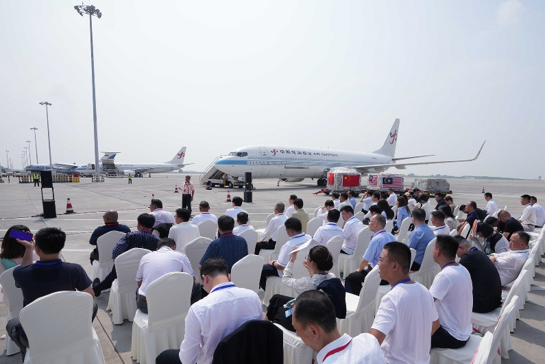 8月25日上午,吉隆坡-鄭州鮮食榴蓮首航接機儀式在鄭州機場舉行,馬來西亞首批鮮食榴蓮進入中國市場,中馬航空貨運樞紐項目加速推進。中豫航空集團黨委書記、董事長張明超,總經理、黨委副書記、副董事長柳建民;馬來西亞駐華大使館工作人員,馬來西亞榴蓮廠商公會代表和榴蓮貿易供應鏈企業(yè)代表參加了儀式。