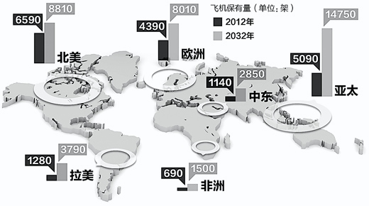 根據(jù)波音公司的預(yù)測,未來20年全球民機市場規(guī)模將翻一番,新興市場成為增長主動力。到2032年,全球?qū)⑿略龀^3.5萬架飛機,總額高達(dá)4.8萬億美元。亞太市場增幅最大,將新增1.282萬架飛機,總額1.89萬億美元。其中,中國市場發(fā)展最為迅速。空客公司總裁兼首席執(zhí)行官密法布里斯·布利葉認(rèn)為,中國航空業(yè)的迅速發(fā)展是中國經(jīng)濟社會發(fā)展的必然產(chǎn)物,中國航空業(yè)發(fā)展的年均增速約為10%,同期全球航空業(yè)的增速則為5%。在未來20年,中國將成為世界最大的航空市場。