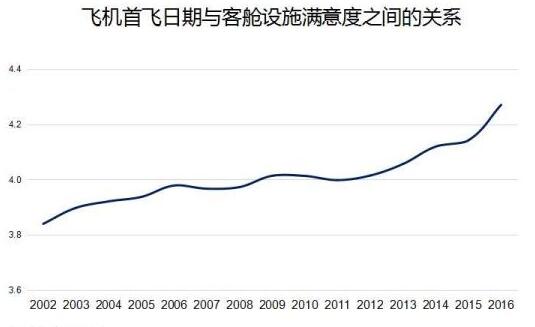 上圖是飛機(jī)首飛日期與客艙設(shè)施滿意度之間的關(guān)系,可以看出首飛日期越近滿意度越高,首飛日期越早滿意度越低,而且是持續(xù)地降低?!耙簿褪钦f我們?nèi)说男枨笤谧兓?,我們得跟上人的需求變化。行業(yè)的標(biāo)準(zhǔn)是持續(xù)的在升級(jí)的,我們需要往前追趕?!?